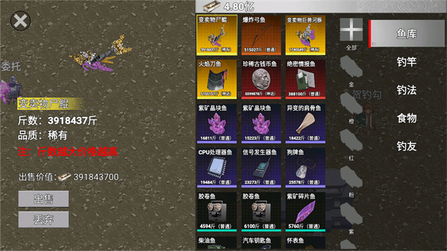 3. 独具武侠风格的装备系统,其中钓竿能够升级成为寒铁鱼竿,鱼线则可以替换成天蚕丝等神兵材料。
