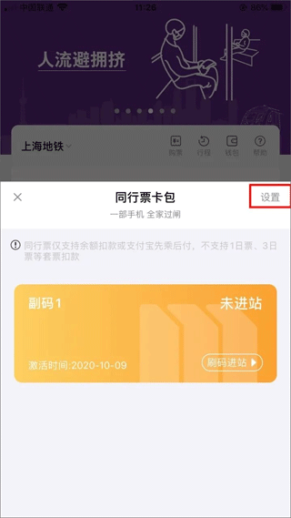 首先,在魔都大都会APP中找到乘车页并打开。接着,把乘车码切换至上海地铁同行票。随后,点击位于乘车码下方的副码,这样就能打开同行票卡包页面,最后在该页面里选择“设置”选项。