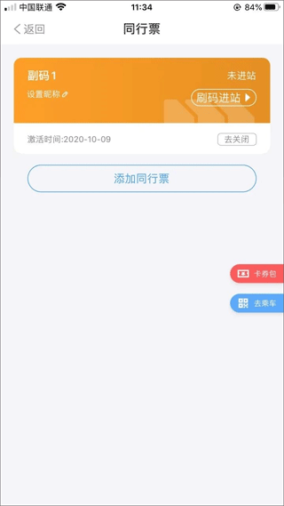 同行票副码激活后可支持关闭。不过,关闭需满足一定前提条件,即该副码不在行程当中。要是该副码呈现已进站但还未出站的状态,那么此副码就不支持关闭。下面介绍关闭同行票副码的操作方法: