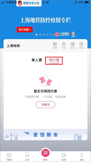 1、 进入乘车页,将二维码切换由“单人票”切换为“同行票” 。