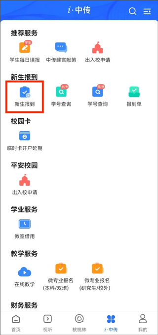 3. 账号激活之后,打开中国传媒大学APP,登录进去后选择“i·中传”板块,点击“新生报到”,就能进入新生报到系统。(新生选房系统的开放时间,请留意中国传媒大学官方微信。)