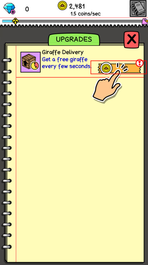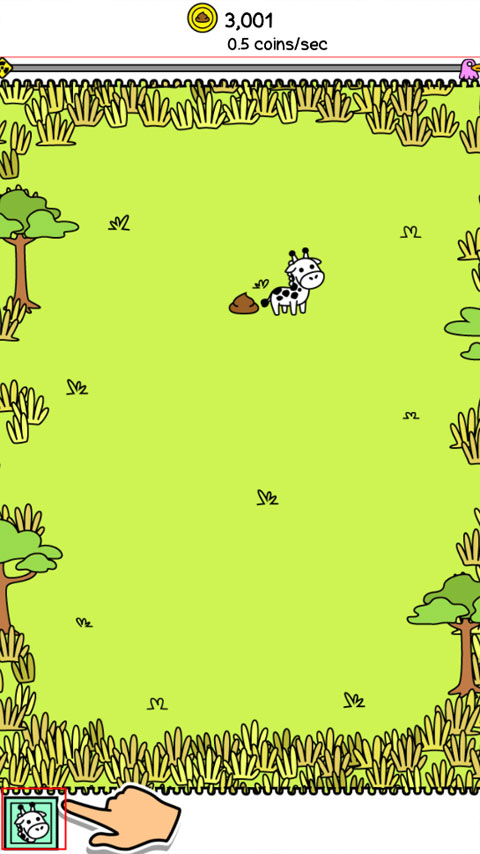 4、接着点击下方双层树的图标,购买箱子放置到屏幕上,箱子中会出现新的长颈鹿。多次点击长颈鹿,它就能快速拉出粪便,你也会因此获得更多金币。