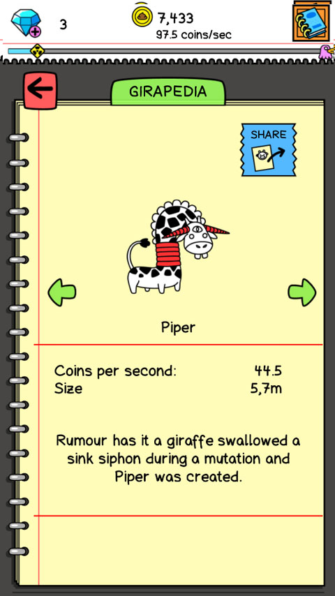 3、把两只长颈鹿合并成一只全新的长颈鹿,不同品种的长颈鹿产出的金币数量差异显著。