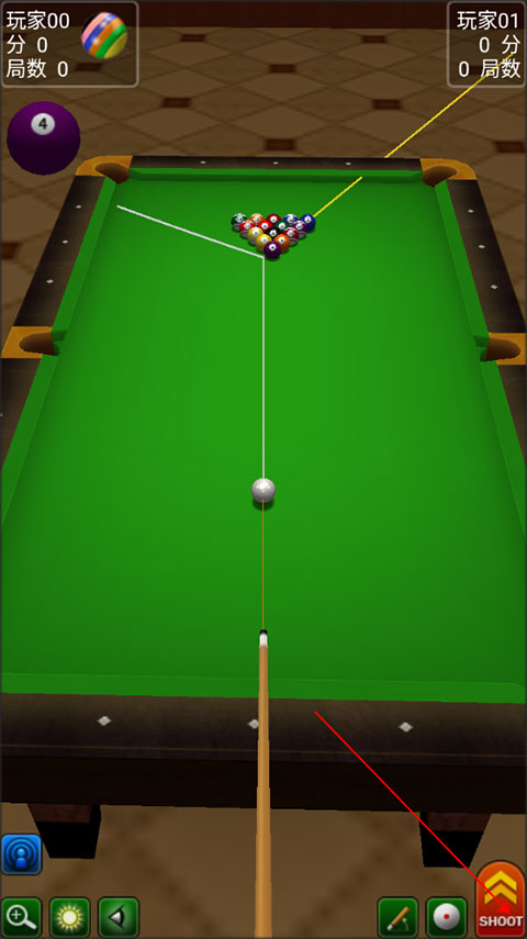 4、你只需要将球杆往后拉,再点击shoot进行打球,跟着辅助线来打球,更加容易进球哦。