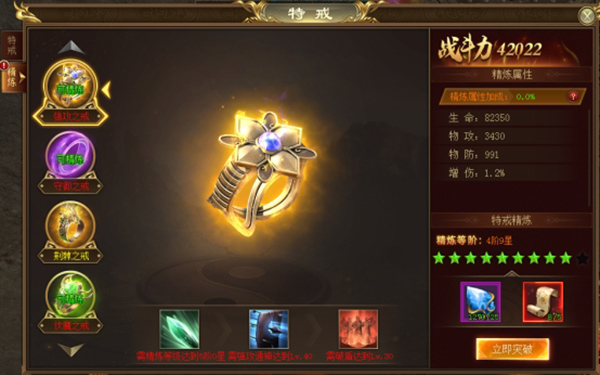 4、可以优先升级特戒系统,可以获得麻痹、护体、复活、诅咒、神力、免伤、吸血、狂暴效果,在大大提升自身升级打怪的效率