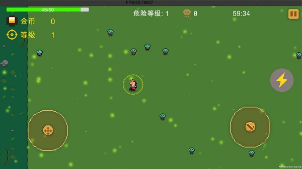 1、这款游戏融合了割草与 Roguelike 玩法,属于弹幕射击类型,操作颇为简单。左下角的按钮用于控制角色移动方向,与之相对的另一侧按钮则是射击按键。和前面提到的几款游戏有所不同,在这里射击并非自动进行,而是需要玩家手动操控,如此一来,玩家便能自主掌控射击方向。