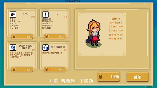 2、其次,经验获取的方式也有所差异。前面提到的那些游戏,玩家需要拾取地下的能量块来获取经验,而这款游戏只需消灭怪物就能增加经验值,并且怪物掉落的物品主要是金币。拾取到的金币能够在升级界面用于购买新武器,还能对现有的武器进行升级强化。要是升级界面里没有玩家心仪的武器或道具,还可以通过刷新来改变场上的选择。