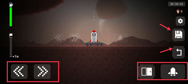 3、下面来介绍基本功能键。左边是左右方向键,用于操控火箭方向;右边是开舱门按钮与发射按钮。红色箭头所指的功能,其一为返回初始状态,其二是用于存档。
