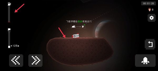 4、游戏玩法为向各个小区域发射火箭,每个区域都可能存在幸存者,你得把他们营救出来。待飞船平稳停住后,左边红色箭头所指的燃料便会自动恢复。