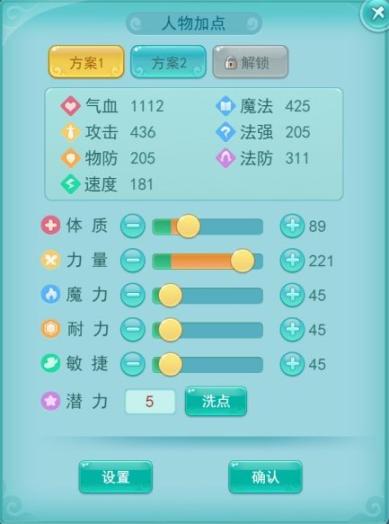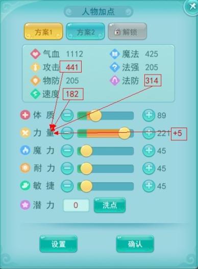 点击主角进入人物加点面板,我们可看到人物角色属性主要由气血、魔法、攻击、法强、物防、法防、速度组成,受到体质、力量、魔力、耐力、敏捷五个潜力加点的影响。