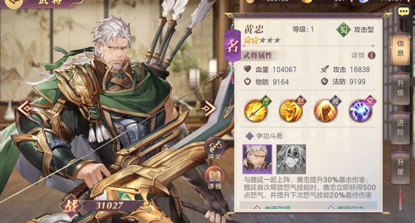 羁绊:与魏延一起上阵,提升30%暴击伤害。魏延释放怒攻后,黄忠获得500怒气,并提升下次20%的怒攻伤害。