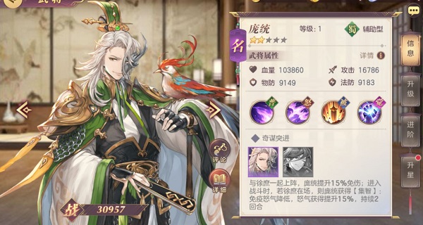 无双进一步提升了庞统的工具人能力,而且如果你只有一个位置,即使不和徐庶一起上阵放弃羁绊效果,庞统依旧是一个非常非常优秀的工具人。当你没有资源又想加强阵容的输出能力是,强烈推荐上庞统!