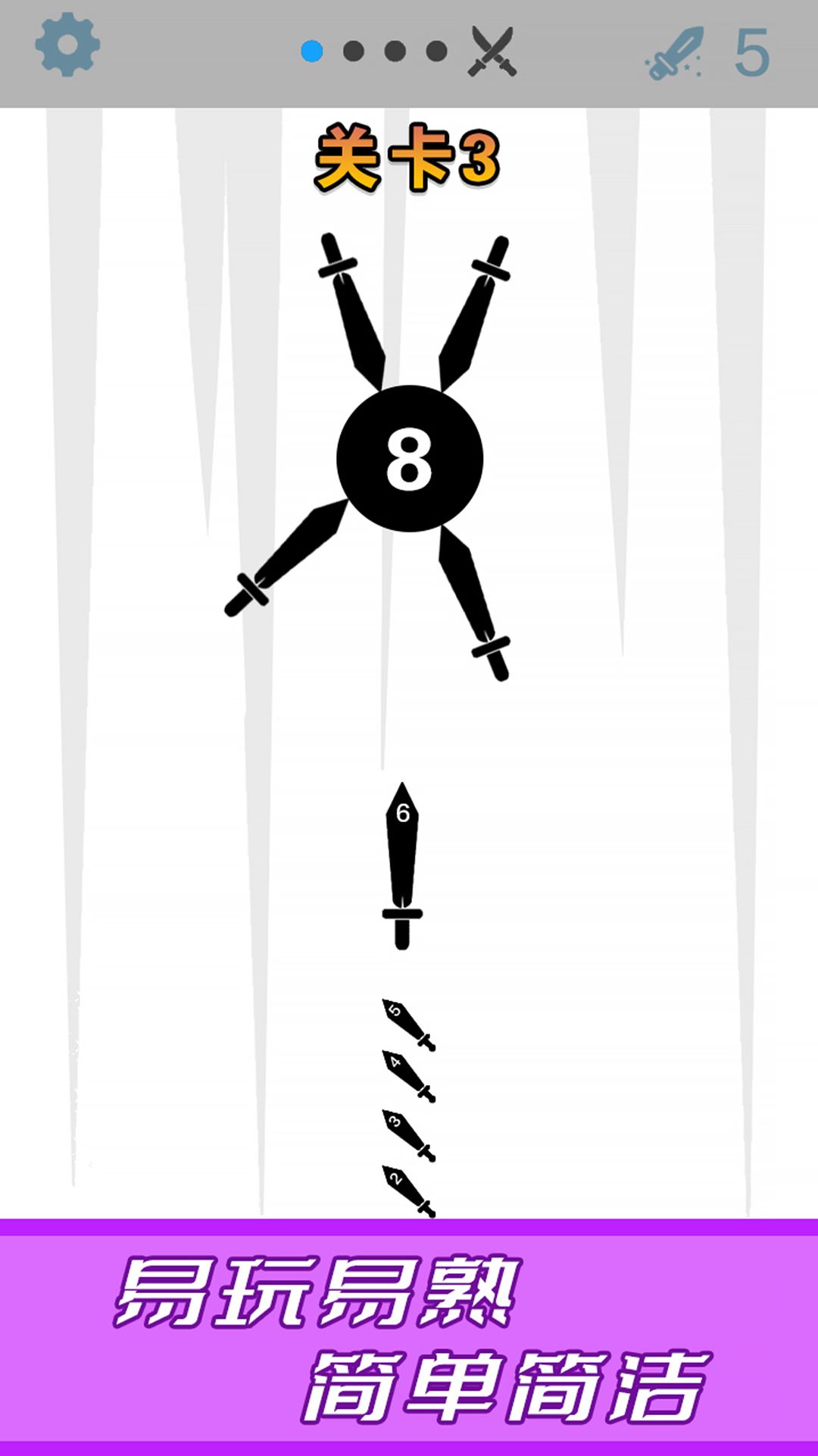 2、通过手指在屏幕上滑动,调整刀的发射方向,点击屏幕即可发射刀。在发射过程中,玩家可以感受到刀飞行的轨迹和速度,根据实际情况进行预判。