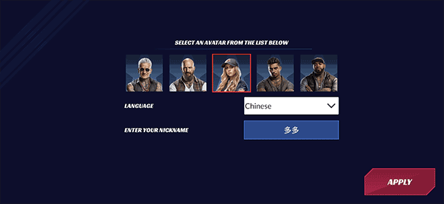 1、启动游戏后,在Language选项里选择Chinese,输入你希望在游戏中使用的昵称,然后点击“APPLY”按钮确认。