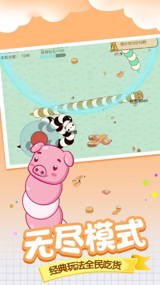 2、在赛场中灵活移动,吃掉更多食物,与此同时,你的对手也会持续前进。