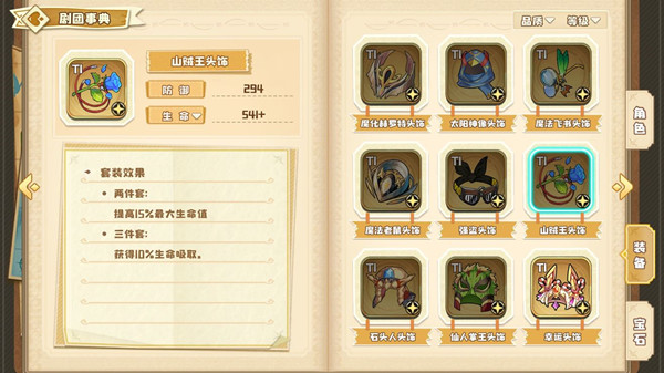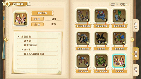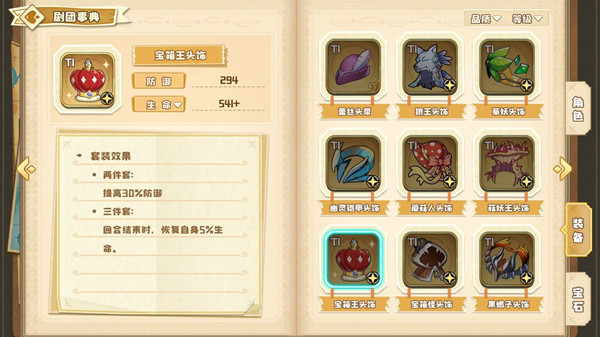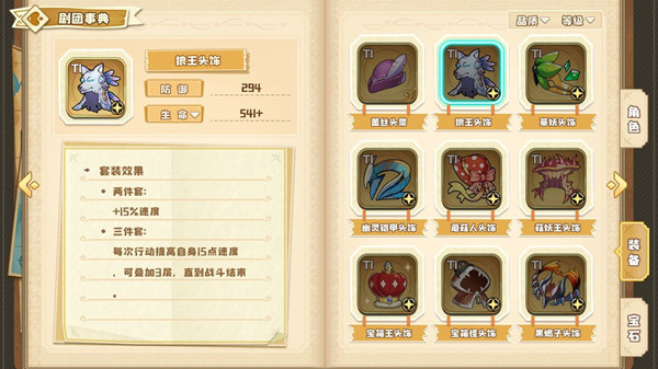 蘑菇人套装:套装属性是提高30%防御,以及自身处于减益效果时增加20%防御,适用于对方能造成减益效果时前排护卫使用。