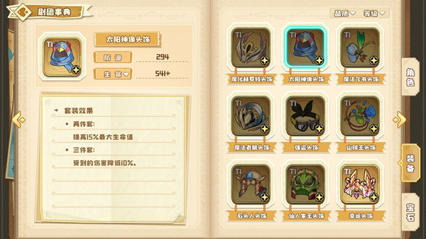 太阳神像套装:套装属性是提高15%最大生命值,以及受到的伤害降低10%,适用于所有前排护卫型演员。