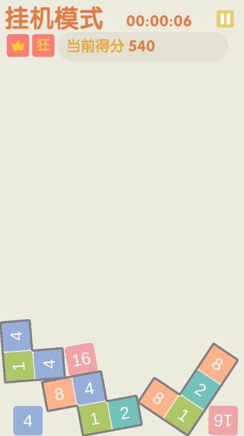 ③挂机模式:或许这堪称游戏里最有趣的模式了,一旦开启,你会不由自主地紧盯着屏幕,10分钟乃至1小时都沉浸其中,光是看着方块自行落下、合成、爆炸,分数不断攀升↑↑↑ 值得一提的是,挂机模式就算中途退出,后续还能接着玩,仿佛永远没有尽头。要是你想加快进程,双击屏幕,方块就会快速砸下,设计得相当人性化。