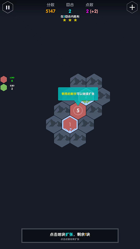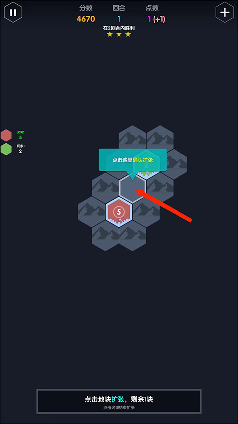 3、如图,红色方为自己的模块,下方为当前剩余的扩张地块,点击【数字5】,