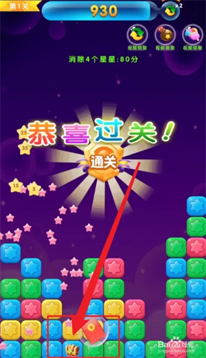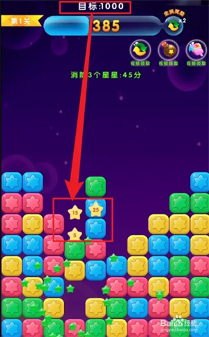 如图所示成功消除星星即可获得分数,在界面上方查看关卡评分目标。
