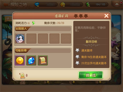探险之地是个人的PvE副本,每次挑战成功都可以获得经验、金币和道具的奖励,而且还可以顺道完成各种任务,在活力充裕的时候,可以进行副本扫荡,快速的获得大量经验。