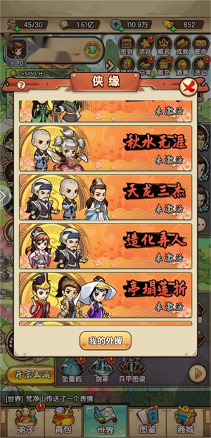 包含弟子、武学、客卿三个图鉴合集,前期主要是完成任务的方式获得弟子、武学以及客卿,当完成招募条件时,可在图鉴处招该弟子或客卿。