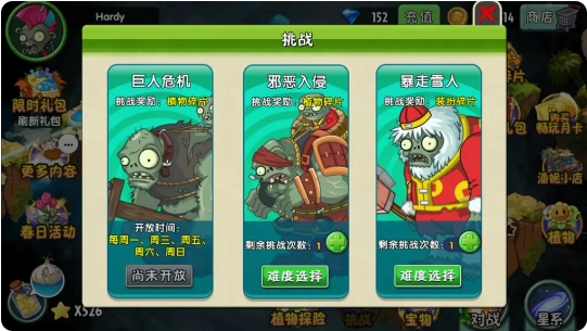 进入一个模式后,我们可以看见有三个模式选择,简单模式僵尸1阶,困难模式僵尸2阶,传奇模式僵尸3阶,大家可以根据自己植物的阶数和想获得的奖励来选择。