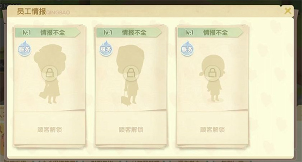 我们可以点开边上的放大镜,查看招聘情报,里面会显示可能招聘到的员工,只有解锁了的才能招聘。当顾客常来光顾,用餐次数多了,我们就有可能将他(她)招募。