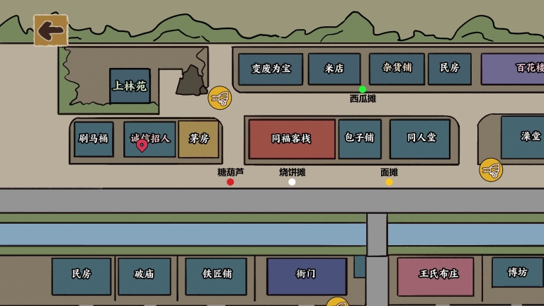 6、进入地图界面,可以看到当前所在的位置,和游戏中各个场景和摊子的地址,
