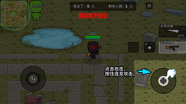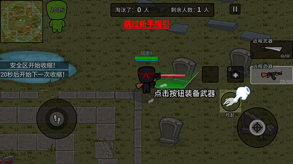 3、降落到地面后,通过拖动左边摇杆来控制角色移动。上方小地图中,绿色圆圈范围内是安全区,圆圈之外则是中毒区域。