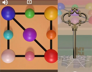 15、先向后退,接着向右转三次,然后在镜子下方的盒子里放上四颗球。放置的规则是:两边大球的颜色要与中间小球的颜色一致,完成此操作后就能获得通关钥匙。拿到钥匙后,向左转两次,用通关钥匙打开门。按照之前从上到下的颜色提示,打开门的颜色顺序依次为黄、橙、红、紫、蓝,完成这些步骤后就算逃脱成功。