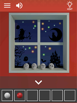 7、后退点右边窗帘打开,注意眼睛数量,再对缠着丝带的黑色南瓜用剪刀发现幽灵。