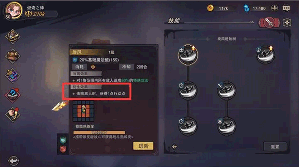 3、旋风斩先进阶【减少50%回血】,然后进阶【击杀敌人回复行动值】。