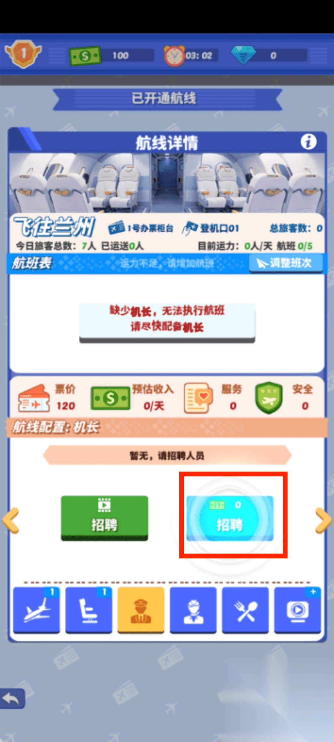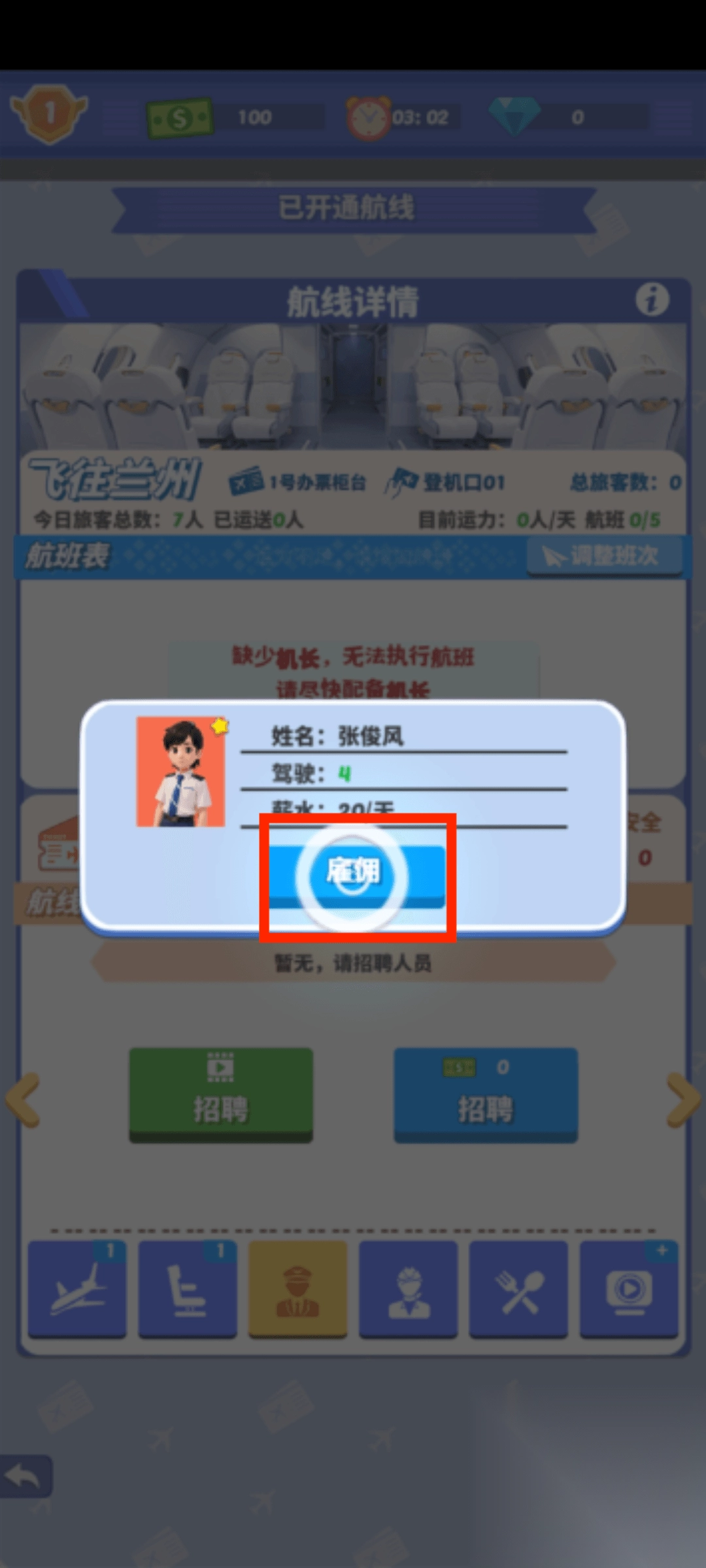 3、点击招聘,找到合适的机长,开始游玩。