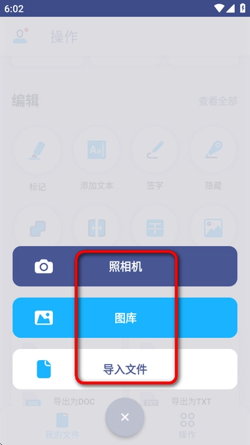 4、选择"拍照"直接扫描文档,选"相册"处理手机图片,"导入"可添加其他文件