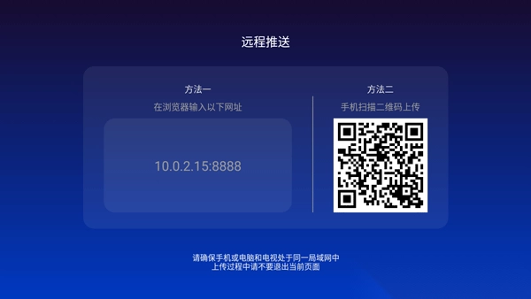 注意:远程推送的时候需要确保手机或者电视处于同一局域网中,上传过程中请不要退出当前页面。