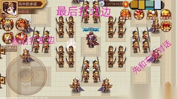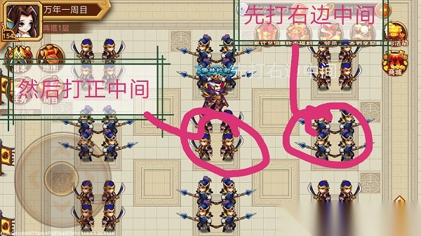 兵阵塔第四层,棋阵,破阵提示语:双車见佳人。这一层本人棋艺不精,改日一定找策划好好切磋一下,这里,只要打一百级的那个就对了,一千级的都是错的,碰到了立马撤退,按下图顺序打就好了。