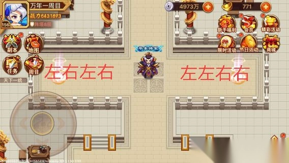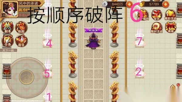 兵阵塔第七层名为二龙出水阵,督阵官提示破阵语:左三点,右中元。把九宫格按时钟看,左边是三点钟,右边中元就是农历的七月十五,也可以理解为七月半,所以应该是七点半方向,如图所示,即可破阵,注意,这里左边和右边阵眼没有顺序分别