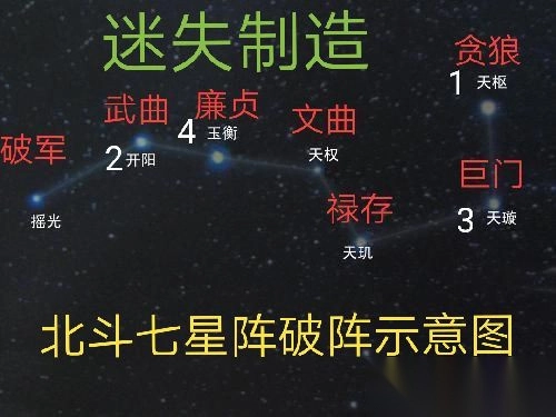 天枢宫贪狼星君、天璇宫巨门星君、天玑宫禄存星君、天权宫文曲星君、玉衡宫廉贞星君、开阳宫武曲星君、摇光宫破军星君。破阵时留意星宫名字,找出提示语的四个星君,即可破阵,如图所示: