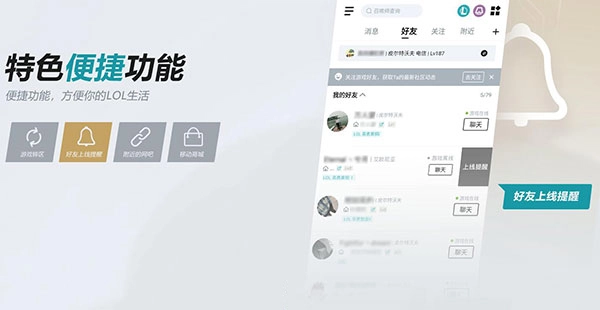 特色便捷功能,助力你的LOL精彩生活!游戏转区、好友上线提醒、附近网吧查找、移动商城等多样便捷功能,等你前来体验!