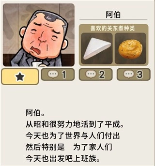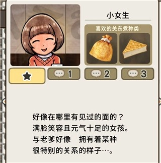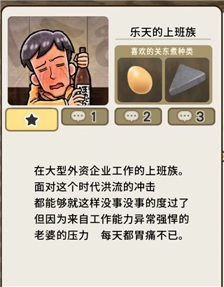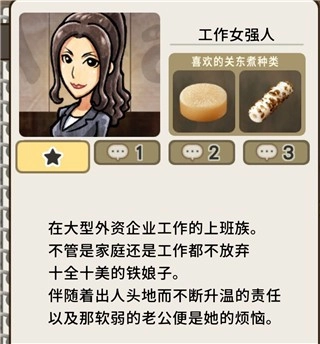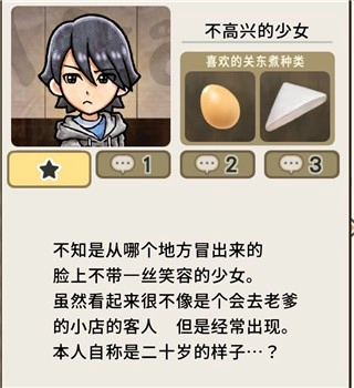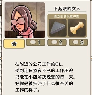 当客人首次出现时,会给人留下一份简单的第一印象。在其出现之后,就能在屏幕下方的菜单中看到具体资料,这些资料涵盖他们各自喜爱的关东煮种类、内心的心声(可通过空缺来掌握角色进度)、常客程度以及结局等信息。