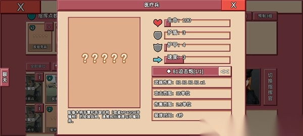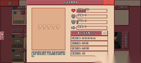 详细:作为游戏中特殊的抛射曲线,没有任何衰减的81伤害,只要有三座阵地在,便使各种装甲望而却步,十点的携带费用也对萌新极其友好,并不算低的血量,极小的中弹面积,也能在特殊时期作为堡垒使用。