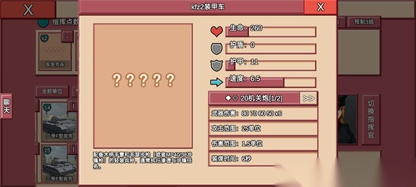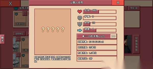 详细:作为山猫的下位替代,与山猫同样的攻击范围,80×6的爆发,让其火力在车辆中极为恐怖,唯一美中不足的是较低的血量与较低的装甲,使其需要人员单位的保护,但比较亲民的价格,以及其快速的机动能力,却是萌新们开荒的不二之选。