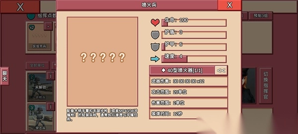 详细:虽然高昂的钻石价格可能会让各位萌新望而却步,但我相信,只要用过指挥官技能,喷火兵班组的人便会喜欢上喷火兵。30×12的总伤足够让他在1-2轮内摧毁任何阵地,四的移动速度与20单位的射程让它便于拉扯,配上医疗兵,什么阵地在他面前都土鸡瓦狗一般。