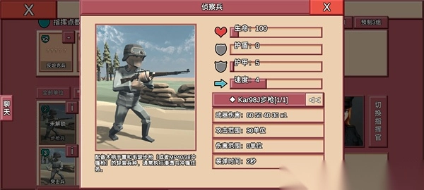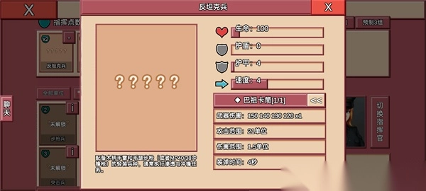 详细:您还缺反坦克单位吗?那么,美国的巴祖卡将是您的不二之选,150的极致伤害,21的极致射程,使他能无伤白嫖,多数装甲车辆单位,极低的价格使它极为亲民,什么,炮弹落点看脸?没关系,极低的携带点数也使他能以量取胜!