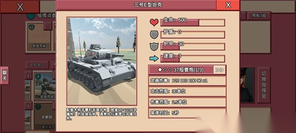 详细:600的血量,30的护甲,让其成为友军们的坚实屏障,一门炮加两挺重机枪的武器配合,也使敌人的进攻脚步大为减缓,如果您因为缺少一位肉盾而无法通过关卡,那么,三号坦克就是你最好的选择!