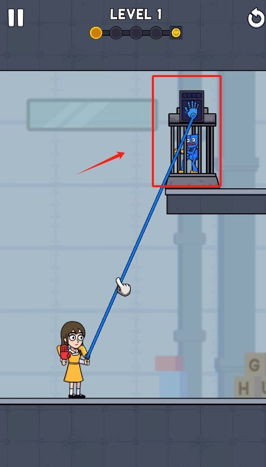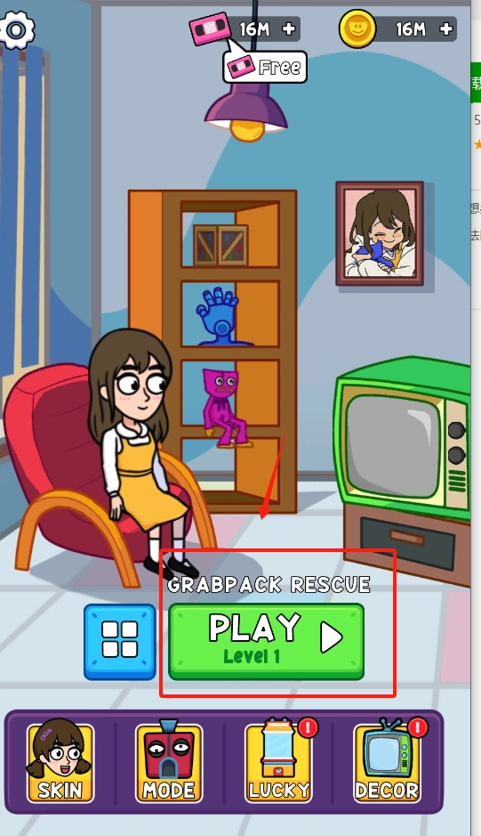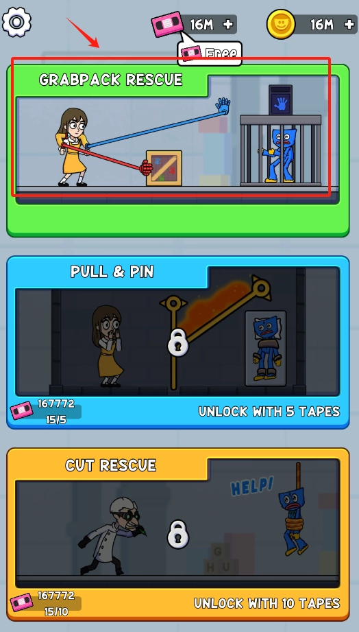 1. 观察金币磁带的数量,女孩拉动磁带解救蓝色小人,选择“GRABPACK RESCUE”关卡开启挑战。