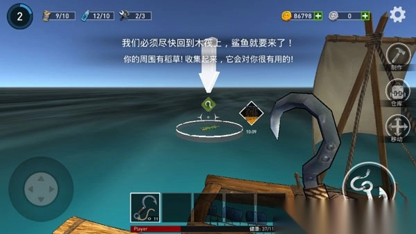 1. 最初的计划设定,在出生时,你仅有4个板子的活动空间以及一个钩子。鲨鱼会不定时地撕咬你的板子,要是你秉持不抵抗的态度,鲨鱼不咬烂一块板子是不会停止的。因此,要尽快利用你手中的钩子去获取资源,水上资源分为三类: