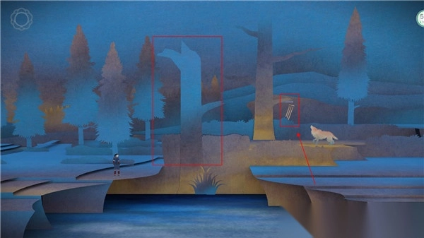 2、双击屏幕后往右边走,能看到下方有条河流无法通过。接着沿着屏幕最下方滑动,就能拉出风铃,这时狼会趴下。(在后续有狼出现的地方,要先找到相同的风铃)随后便会出现一座桥,从桥上走过去,就能进入下一个场景。