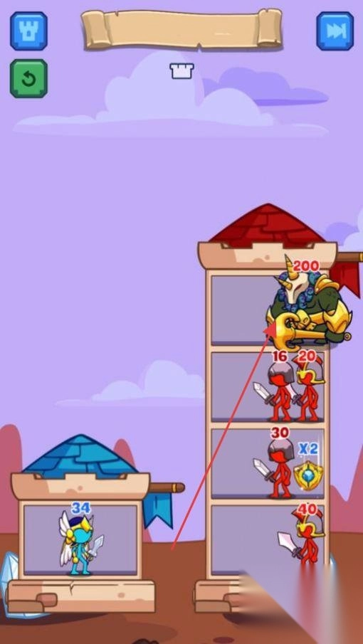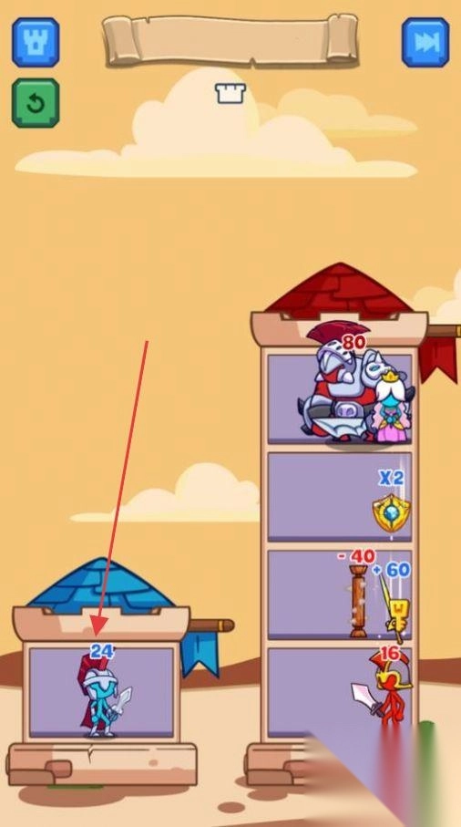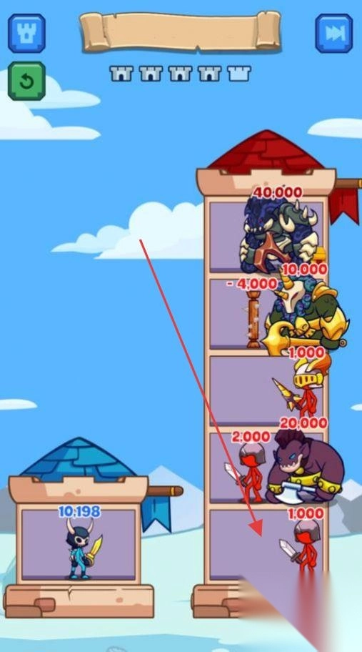1、点击己方塔楼(左侧建筑),派遣角色(如数字标识的骑士)出击,进攻敌方塔楼(右侧多层建筑)。
